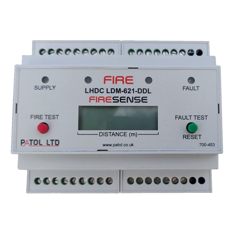 INTERFACE DE DETCETION LINEAIRE DE TEMPERATURE 2KM A AFFICHEUR DE DISTANCE PAR METRE, 14-30 VDC AVEC DEUX SORTIES RELAIS ALARME ET DEUX SORTIES RELAIS DEFAUT.